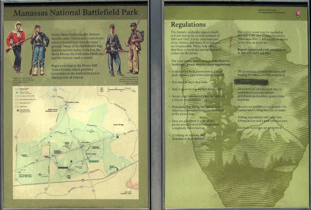 The Chinn Ridge Orientation marker is next to the parking area at Stop Ten of the Manassas Battlefield Auto Tour.