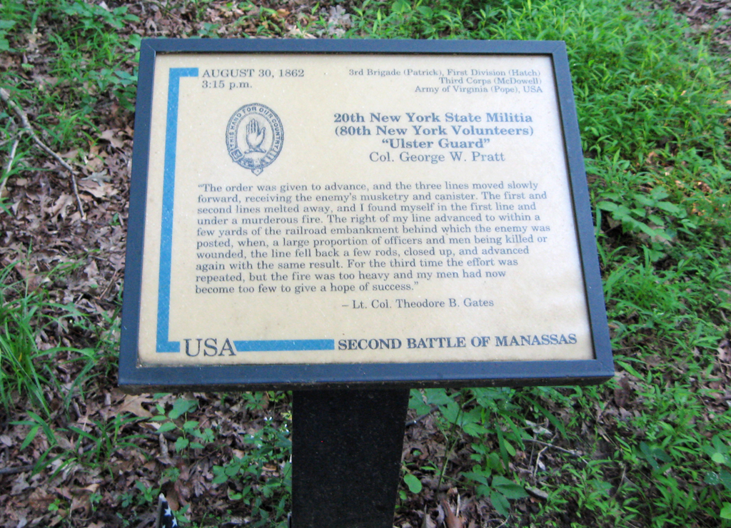 The 20th New York State Militia trailside marker is on the Deep Cut loop trail at Stop 7 of the Manassas Battlefield Driving Tour.