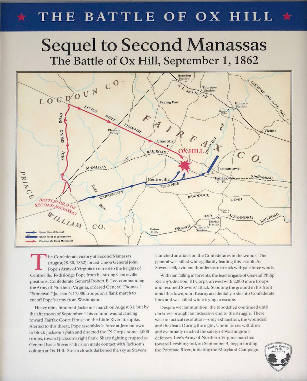 The Battle of Ox Hill (Chantilly) was fought across 500 acres of Fairfax County farm fields and woods. Today, the 4.9-acre Ox Hill Battlefield Park preserves the last remaining ground of the historic battlefield. Examine this photograph and see where the battle was fought. Compare the deployment areas, troop positions and battle lines with the highways and urban development on the site today.