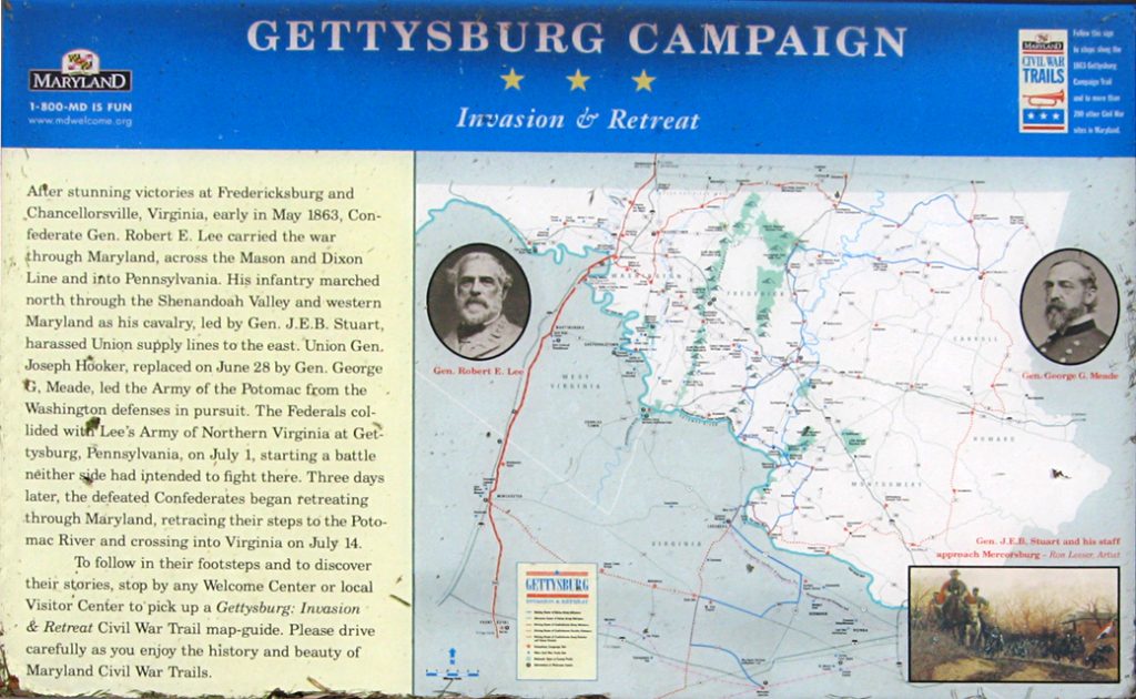 After stunning victories at Fredericksburg and Chancellorsville, Virginia, early in May 1863, Confederate Gen. Robert E. Lee carried the war through Maryland, across the Mason and Dixon Line and into Pennsylvania. His infantry marched north through the Shenandoah Valley and western Maryland as his cavalry, led by Gen. J.E.B. Stuart, harassed Union supply lines to the east. Union Gen. Joseph Hooker, replaced on June 28 by Gen. George G. Meade, led the Army of the Potomac from the Washington defenses in pursuit. The Federals collided with Lee’s Army of Northern Virginia at Gettysburg, Pennsylvania, on July 1, starting a battle neither side had intended to fight there. Three days later, the defeated Confederates began retreating through Maryland, retracing their steps to the Potomac River and crossing into Virginia on July 14.