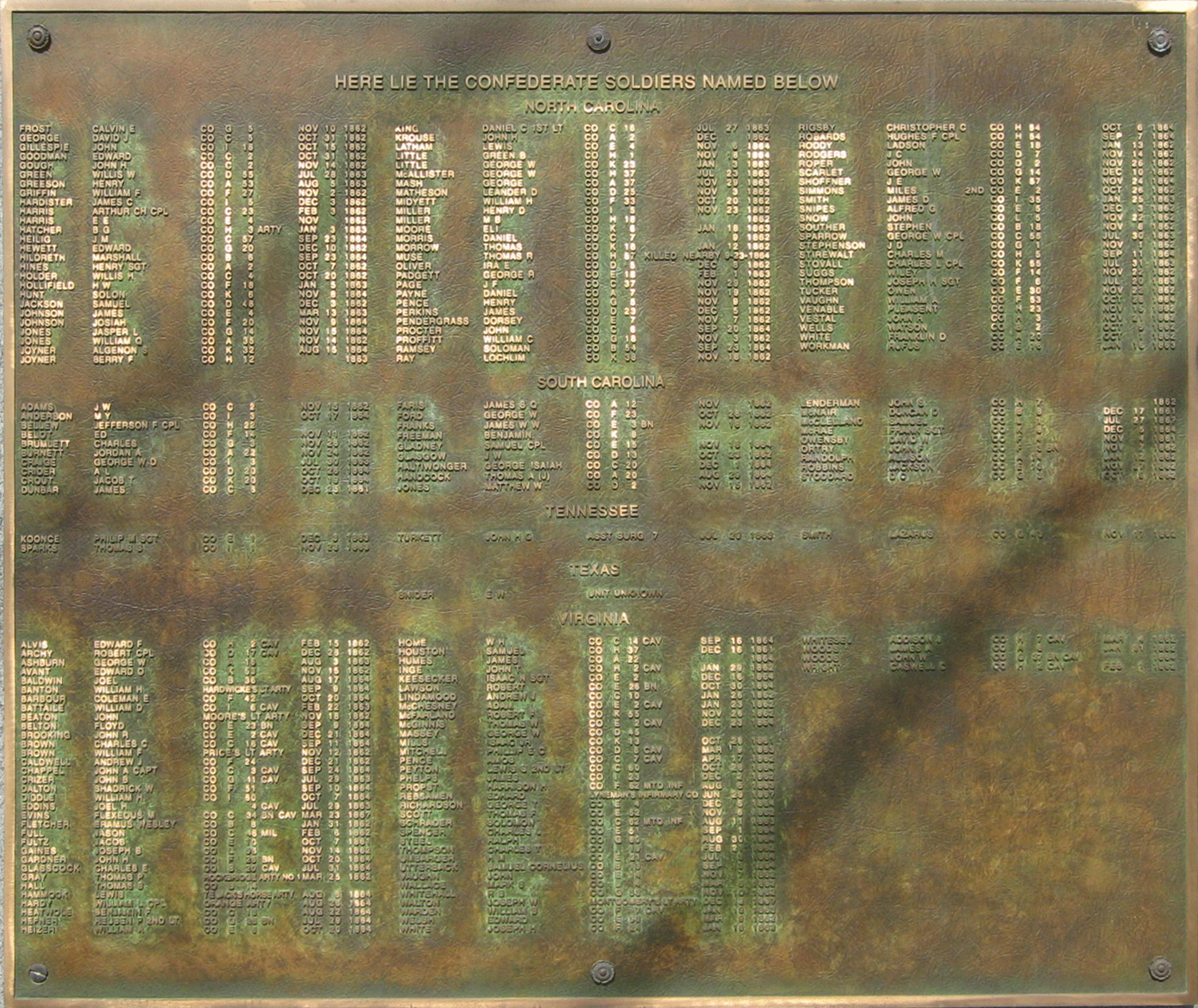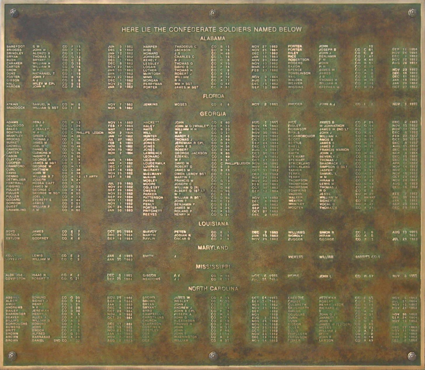 Four bronze tablets on the side pillars list the names, states, units and death dates of the 359 Confederate soldiers in the cemetery. The graves of the soldiers were originally marked with this information, but after the war the graves were neglected. By the time the United Daughters of the Confederacy erected the monument To All Confederates, 112 had been lost. Today only three of the original 359 still stand. The four tablets consist of: