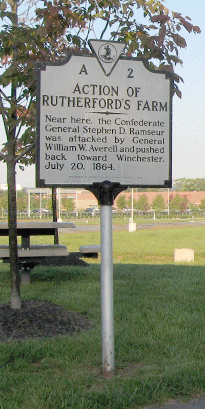 The marker is one of three Virginia historical markers relocated to a small park east of the Rutherford Crossing shopping center