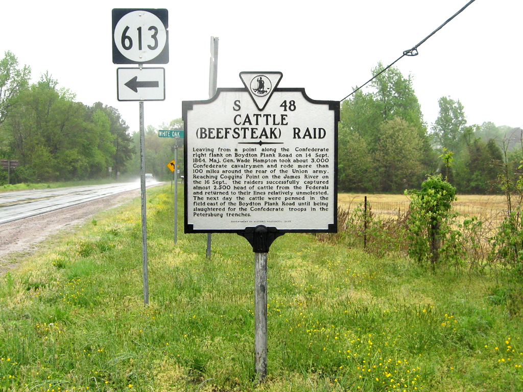 The Cattle (Beefsteak) Raid Virginia historical marker S48 commemorates the raid made by Confederate Major General Wade Hampton and 3,000 cavalry on September 14-17, 1864. It is a few feet from the White Oak Road S52 Virginia historical marker.