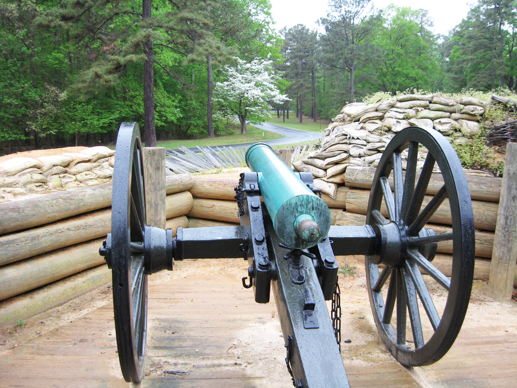 Critical locations in the defenses were strengthened with artillery. Smoothbore cannon such as this one were popular at relatively close ranges because they could fire larger charges of deadly canister – basically a giant shotgun shell consisting of a can filled with iron balls – than smaller-bored rifled artillery. The dense woods and trench warfare around Petersburg was not ideal for longer ranged rifled field artillery, and the Federal armies actually reduced their proportion of modern rifled pieces in favor of smoothbores during the siege.