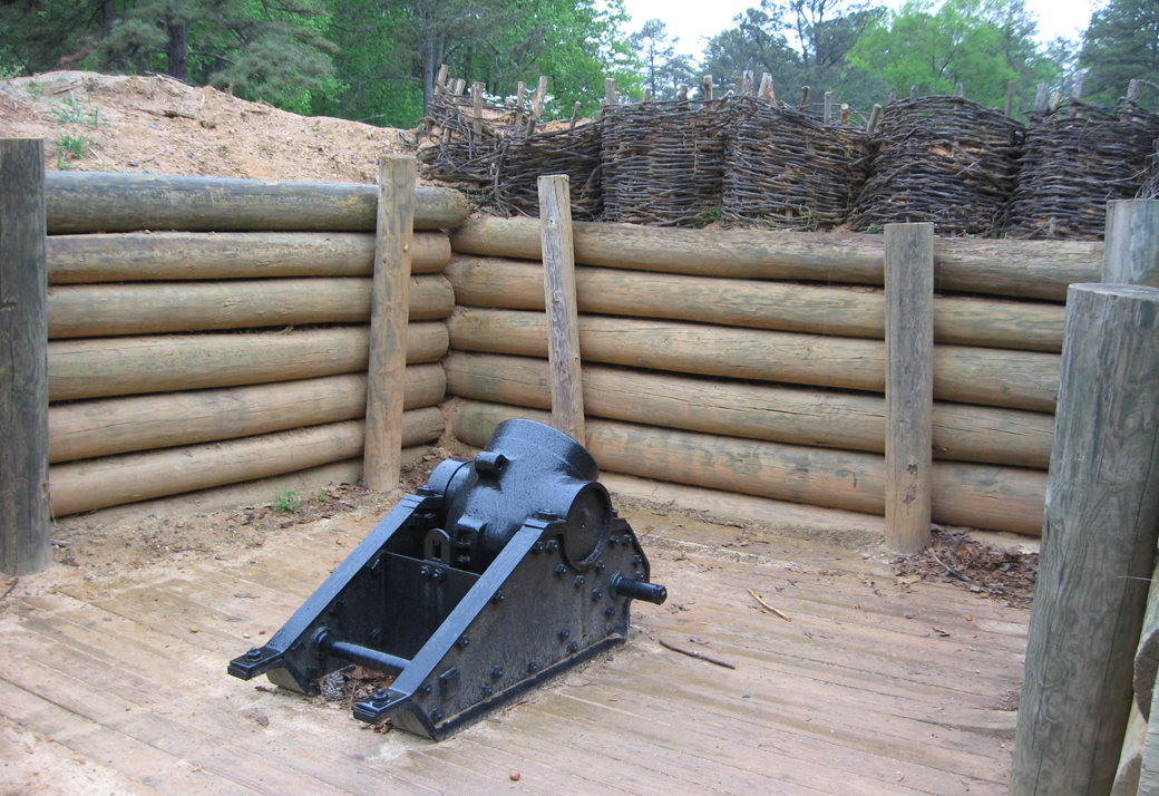 Reconstructions of typical defensive positions in the Petersburg siege works are at Stop Three on the Petersburg National Battlefield Eastern Front Auto Tour, along with a reconstruction of a winter soldiers’ hut. The nearby ‘Infantry Earthworks’ wayside marker provides details on the defenses.
