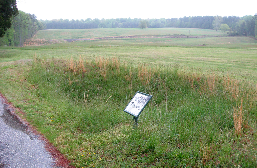 (above) Near the top of the ridge the mine was almost found by a Confederate Countermine. The Confederate defenders knew the Federals were up to something and took countermeasures, including this countermine, a backup earthwork called a “cavalier” behind the main readout, and extensive backup and communication trenches behind the main line. Although the countermine failed, the other measures all contributed to to some extent to the failure of the Union attack.