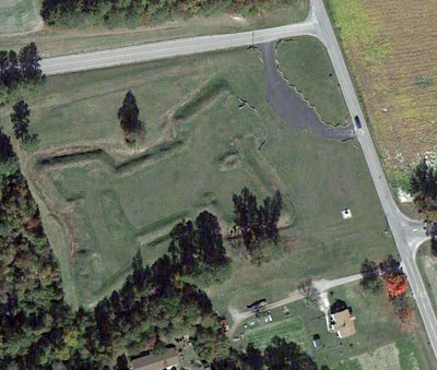 Although Fort Wadsworth looks like a jumble of earthworks from the ground, this Google aerial photograph shows it to be a well-defined fort with four redans. Halifax Road is along the right. Flank Road runs east-west across the top and off to the right. The monument to Hagood’s South Carolina Brigade can be easily made out to the right of the fort.